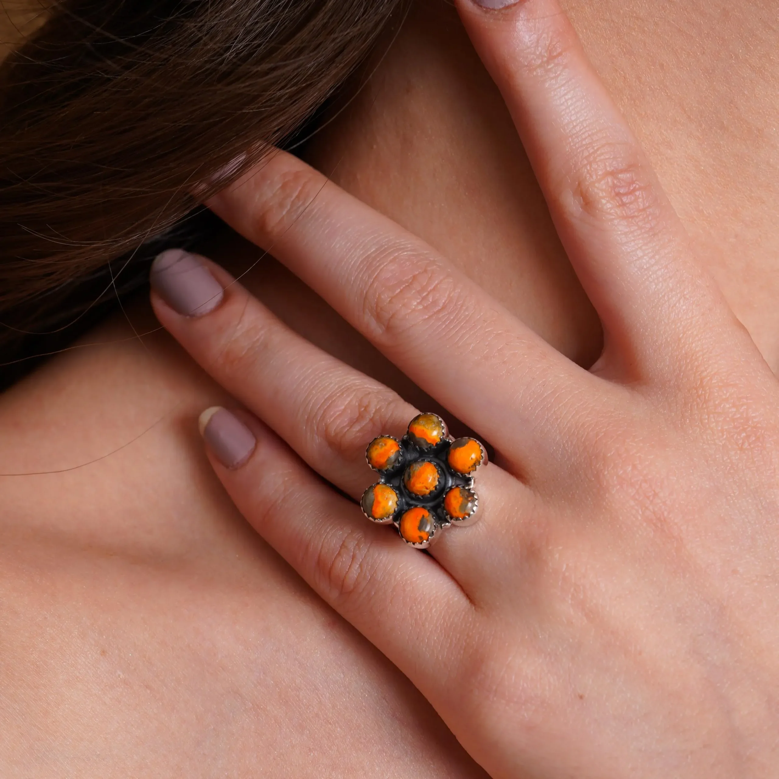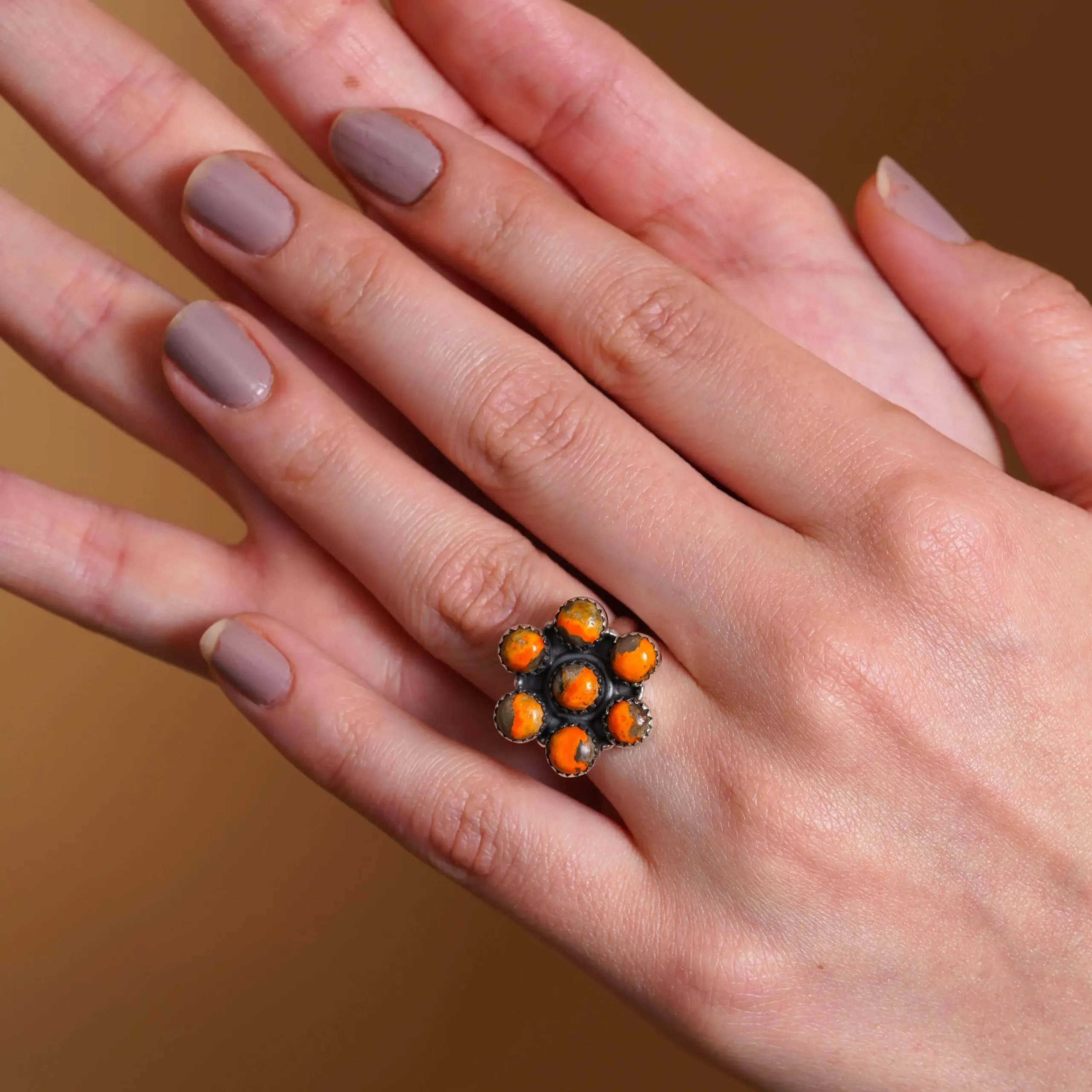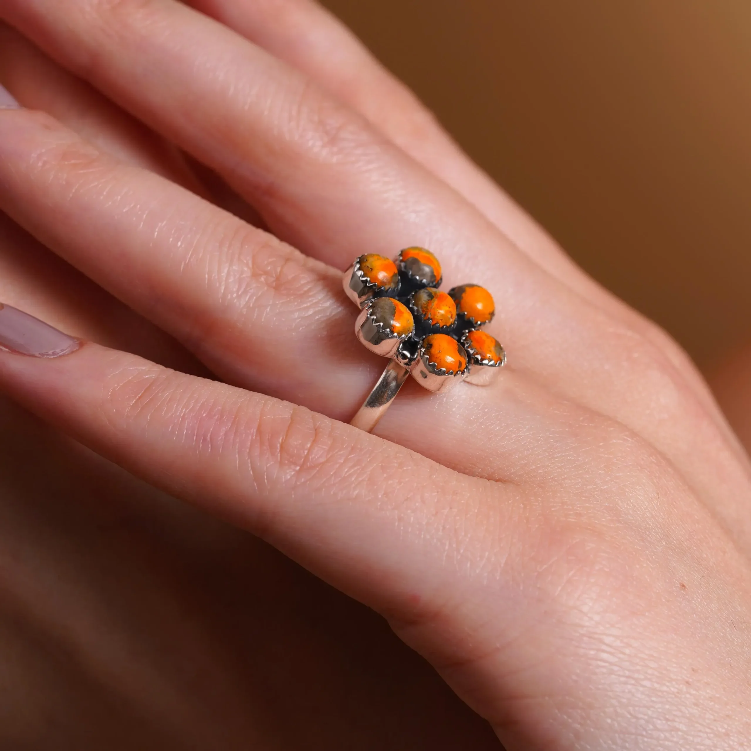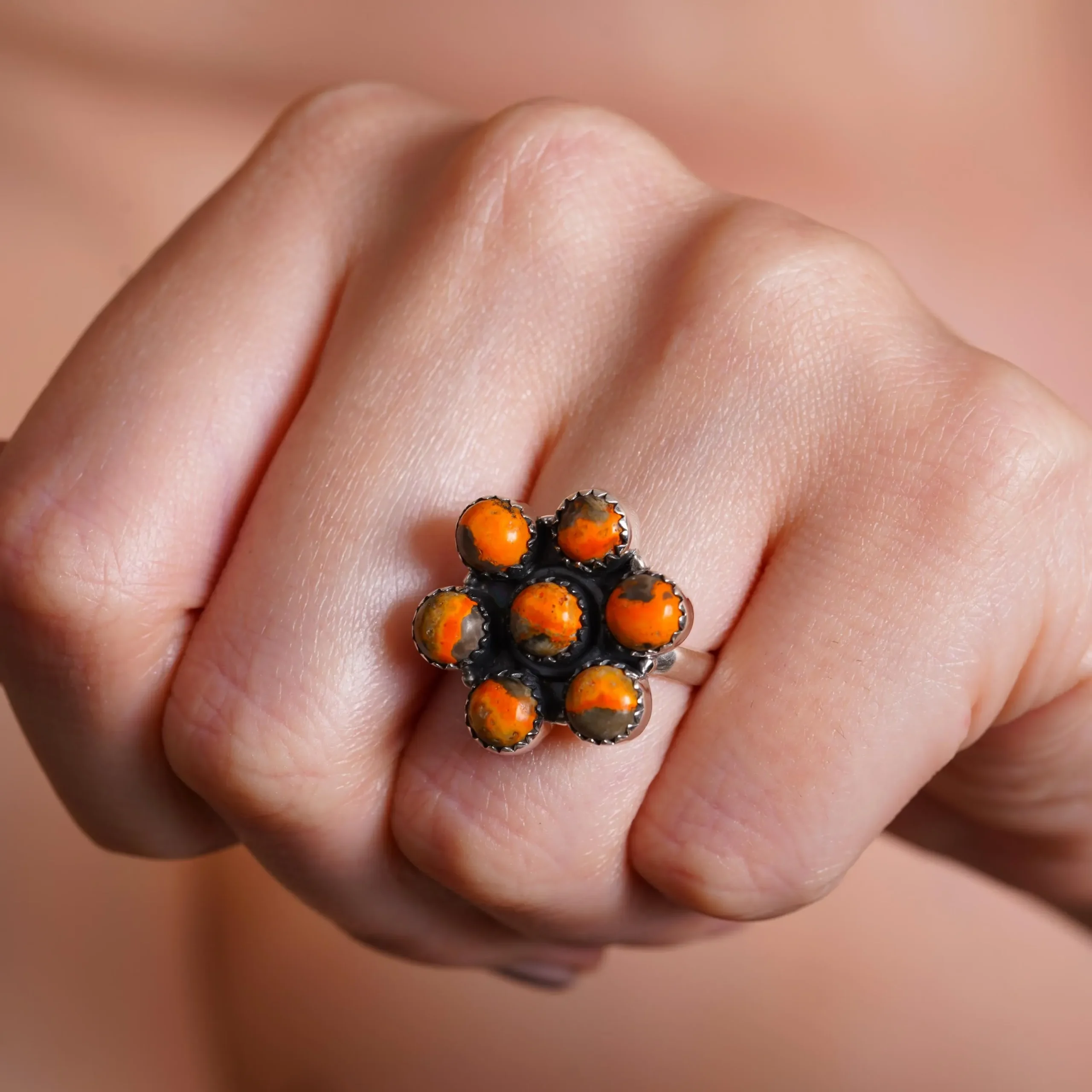Bumble Bee Stone Flower Ring with Orange Beads | Silver-Toned Statement Ring | Handmade Boho Jewelry for Women