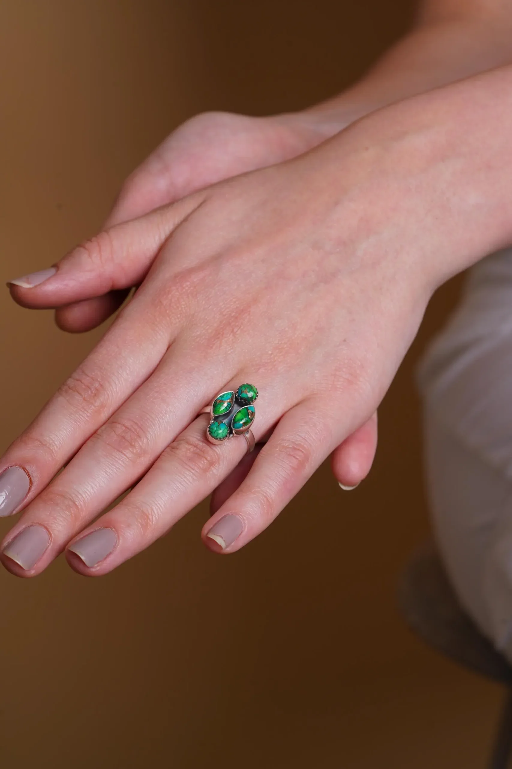The ring features an elegant cluster arrangement of four natural green gemstones, thoughtfully positioned to create balance, dimension, and organic movement. The asymmetrical cluster design gives the ring a modern yet earthy aesthetic, inspired by nature and botanical forms. The varying shapes and sizes of the stones enhance the handcrafted feel and ensure that each ring has its own unique character.