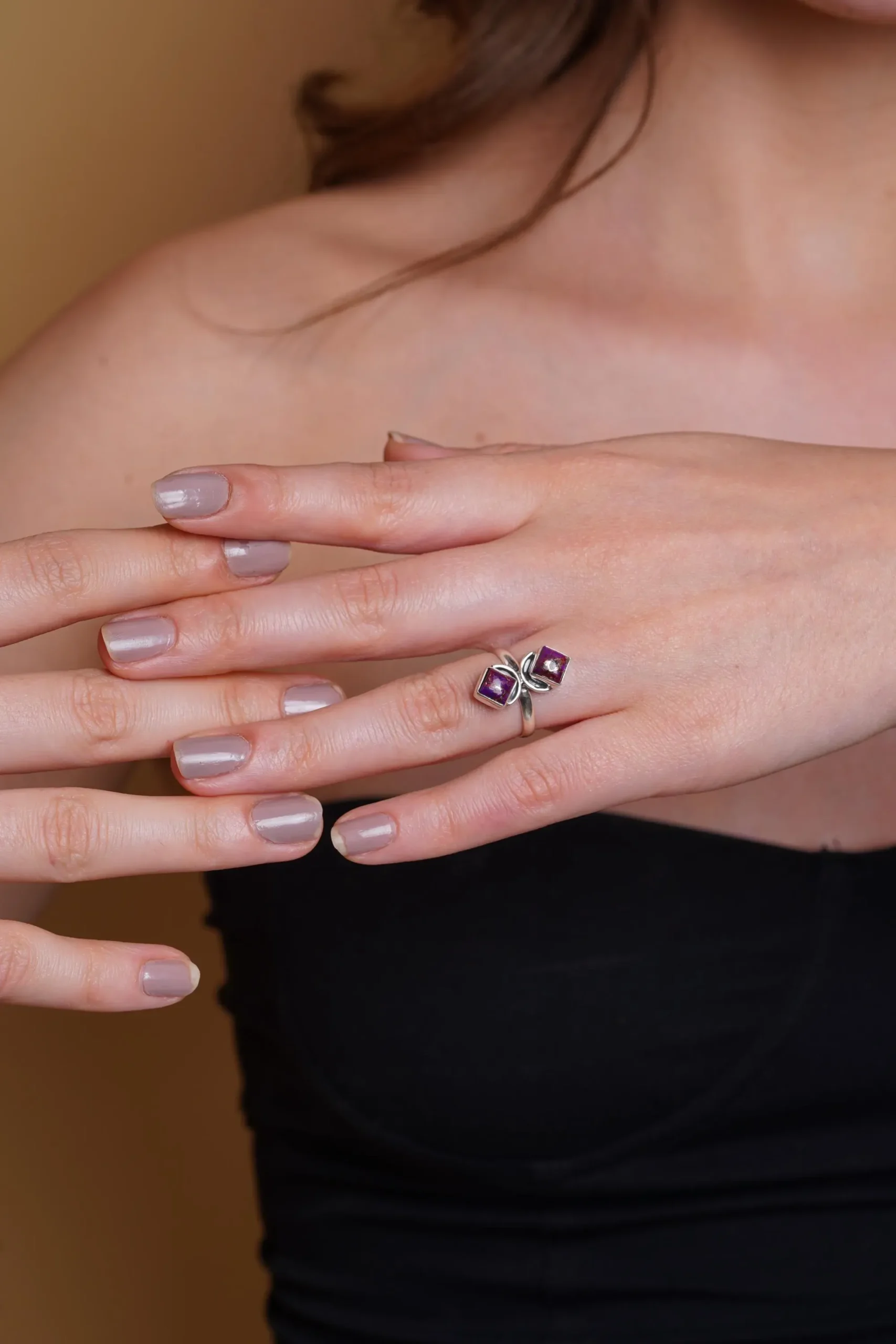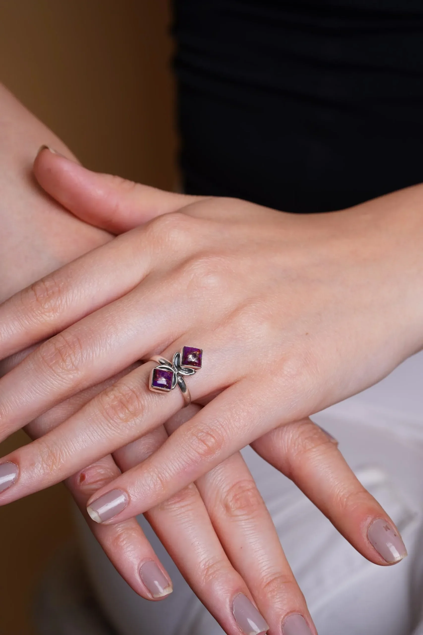 Delicate yet distinctive, this handcrafted silver ring features a graceful floral-inspired design accented with two square-cut amethyst gemstones. Thoughtfully designed for everyday elegance, this piece blends minimalism with artisanal charm, making it a timeless addition to any jewelry collection.