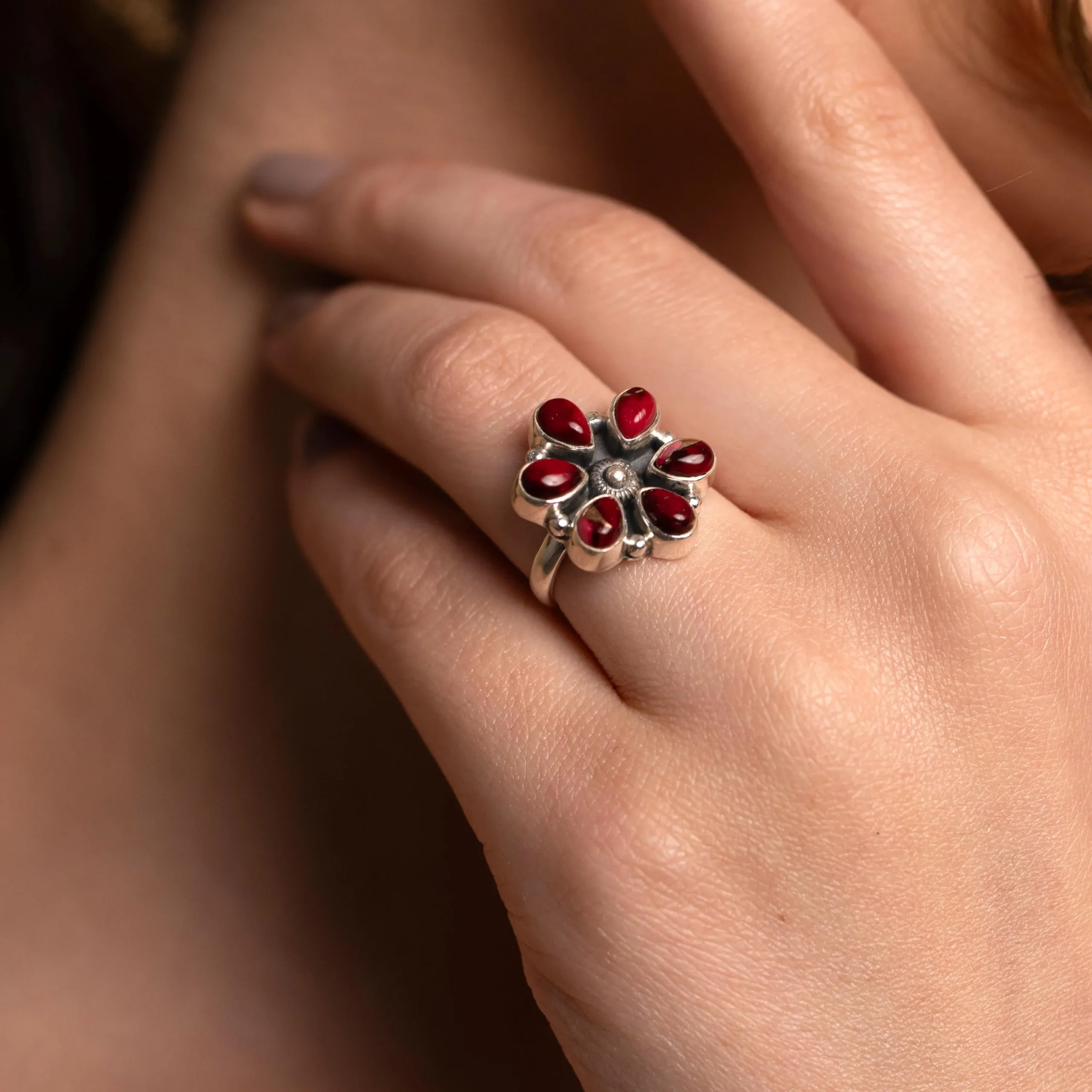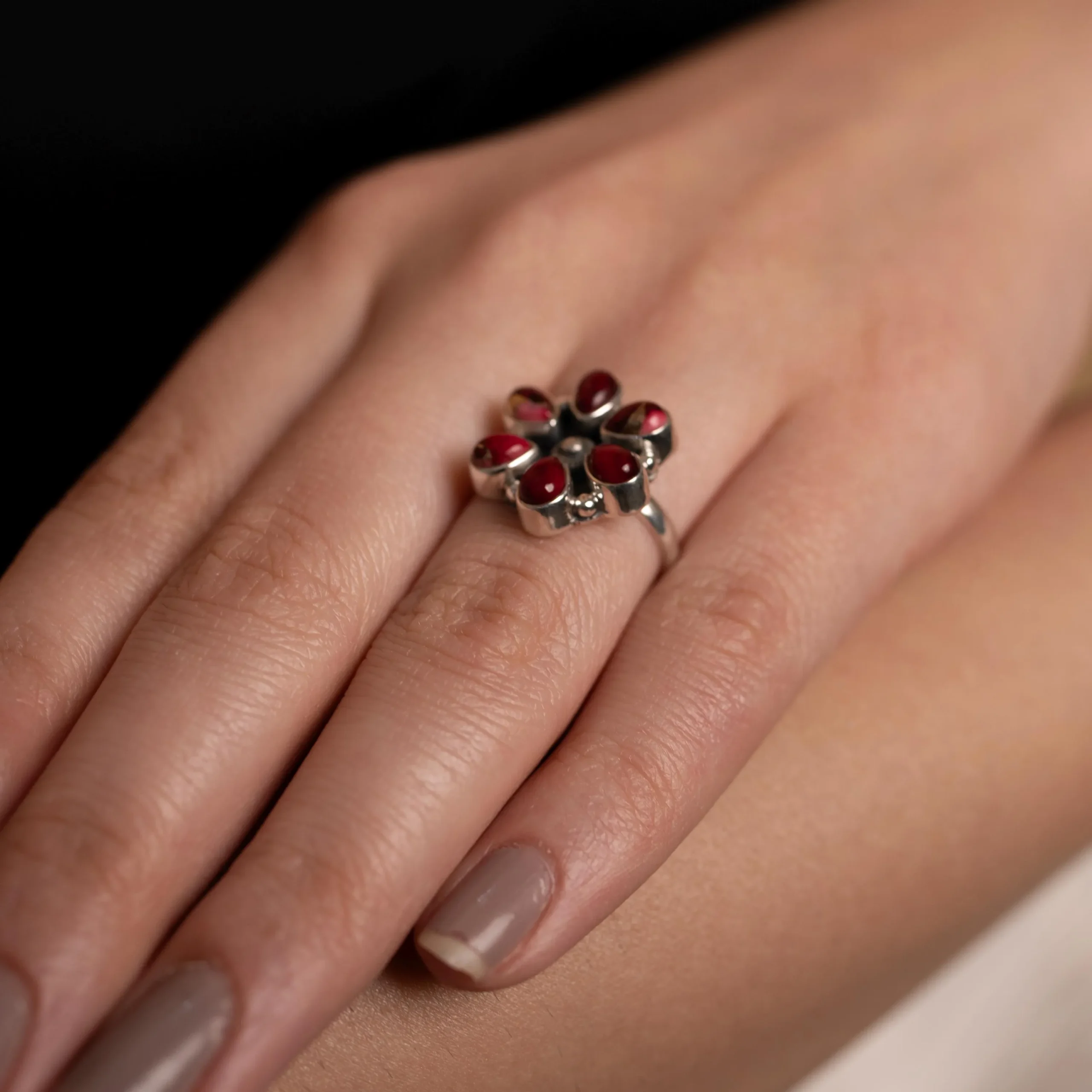 Each ring is carefully handmade, allowing the natural beauty of the garnet gemstone to take center stage. The polished sterling silver band provides a refined finish and comfortable fit, making this ring suitable for both everyday wear and special occasions. Whether styled as a bold statement piece or worn as a classic gemstone ring, it effortlessly complements boho, vintage, and contemporary styles.