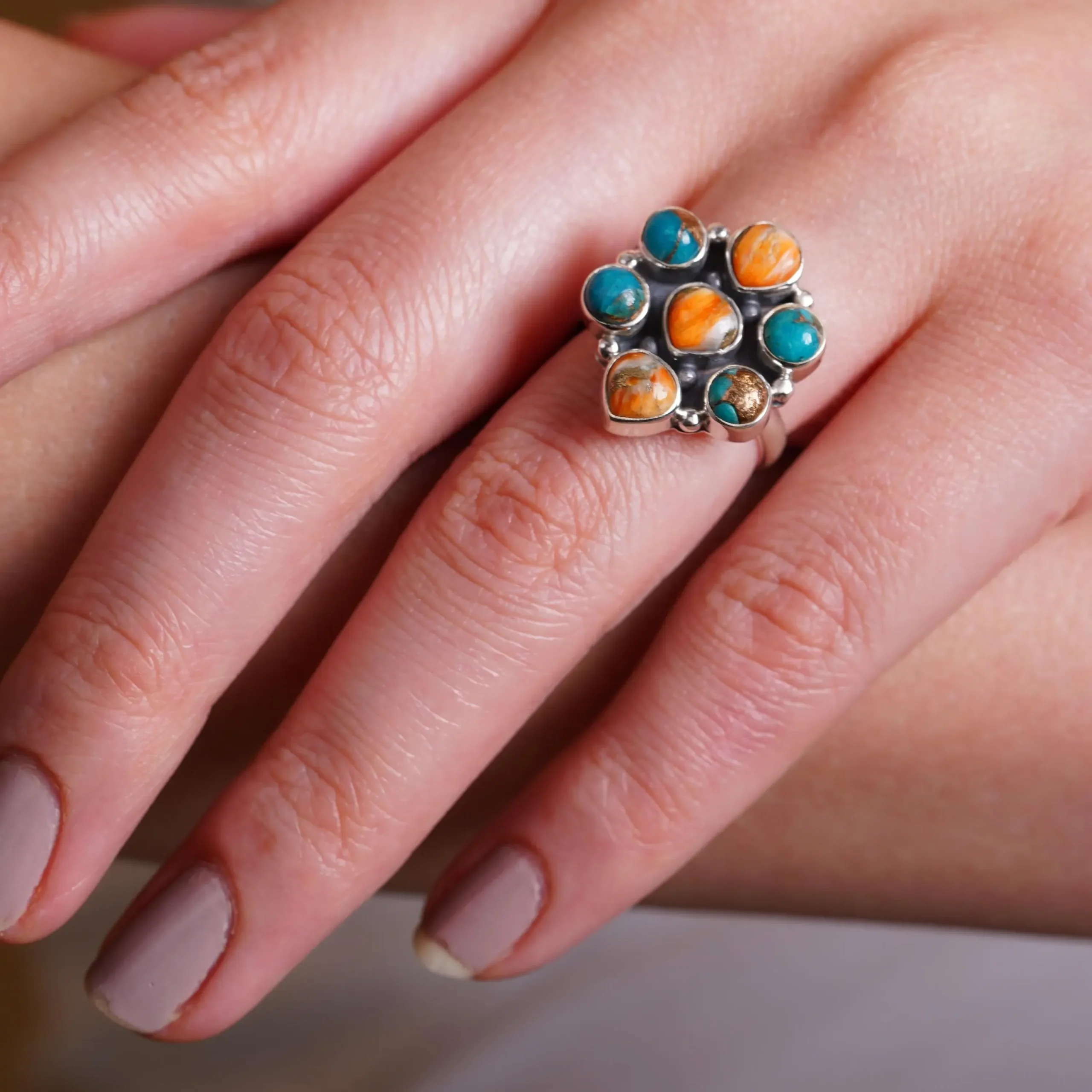 Make a bold and artistic statement with this handcrafted Turquoise & Orange Spiny Oyster Cluster Ring, beautifully designed in genuine 925 sterling silver. Featuring a striking combination of vibrant blue, turquoise, and warm orange spiny oyster gemstones, this ring captures the essence of Southwestern-inspired jewelry with a modern handcrafted touch.