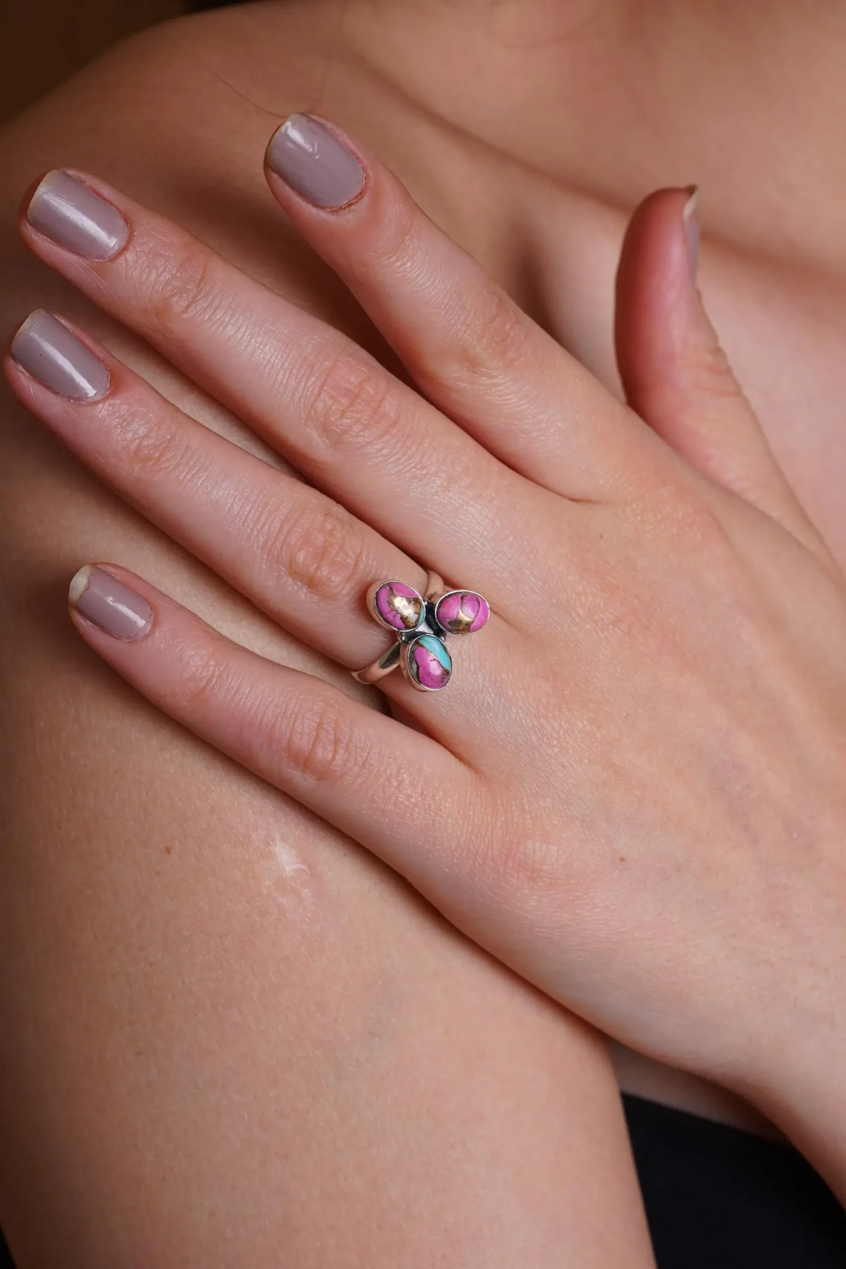 Add a touch of artistic elegance to your jewelry collection with this handcrafted Pink Copper Turquoise Cluster Ring, beautifully made in genuine 925 sterling silver. Featuring three striking pink turquoise gemstones accented with natural copper veining, this ring is a bold yet refined statement piece.