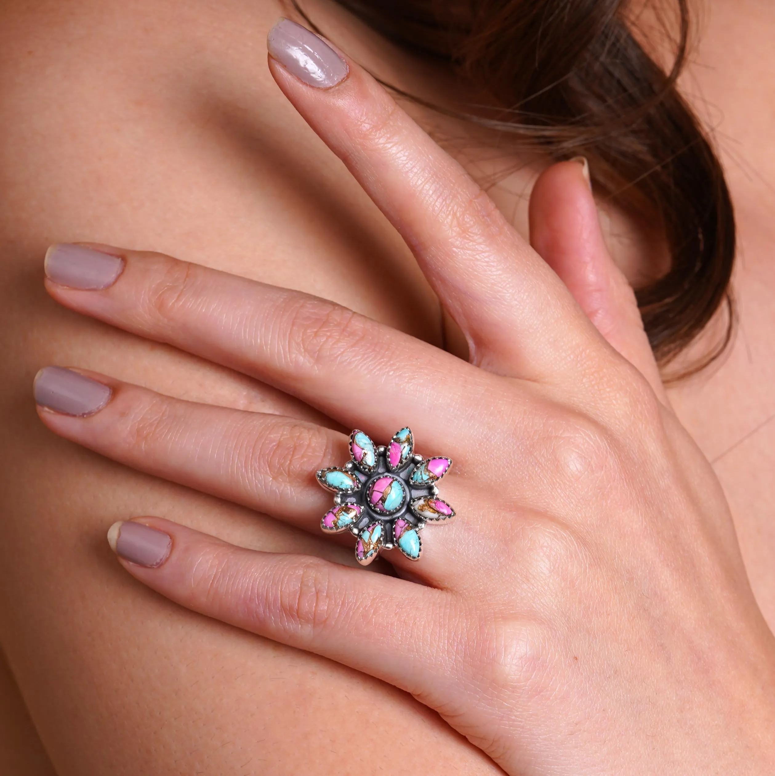Elevate your style with this stunning handmade Sterling Silver Cluster Ring, beautifully adorned with vibrant pink Cotton Candy turquoise and classic blue turquoise stones. Each gemstone is carefully hand-selected and set by skilled artisans, giving the ring its unique charm and captivating color contrast.